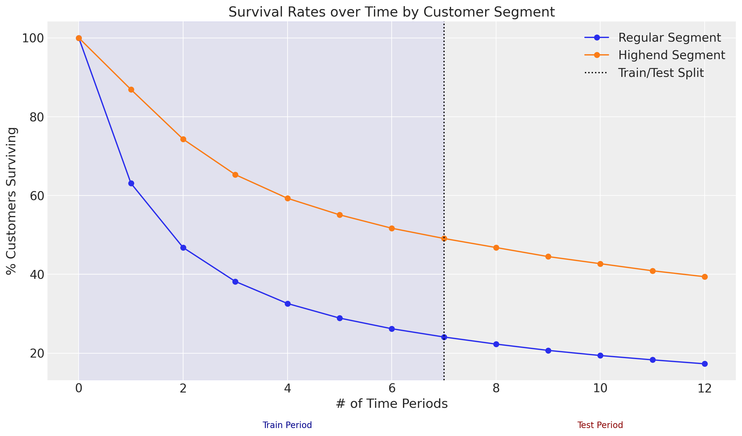 This dataset was generated from the first 8 time periods in Table 1 of the research paper, which provides survival rates for two types of customers (“Regular” and “Highend”) over 13 time periods: