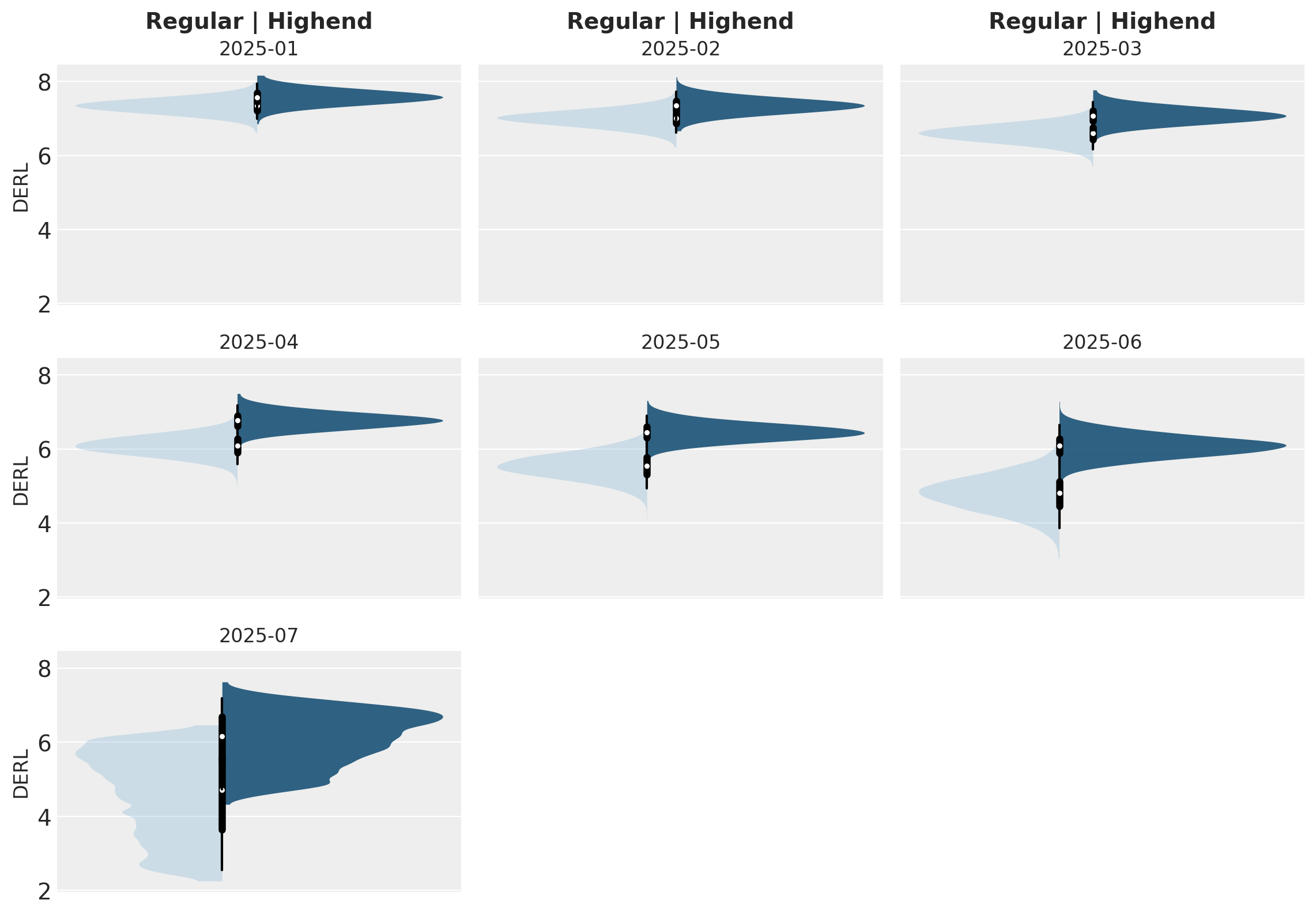 We can see the segment DERL estimates in the later cohorts are quite different and broadly distributed, but over time variance decreases and segments become more similar.